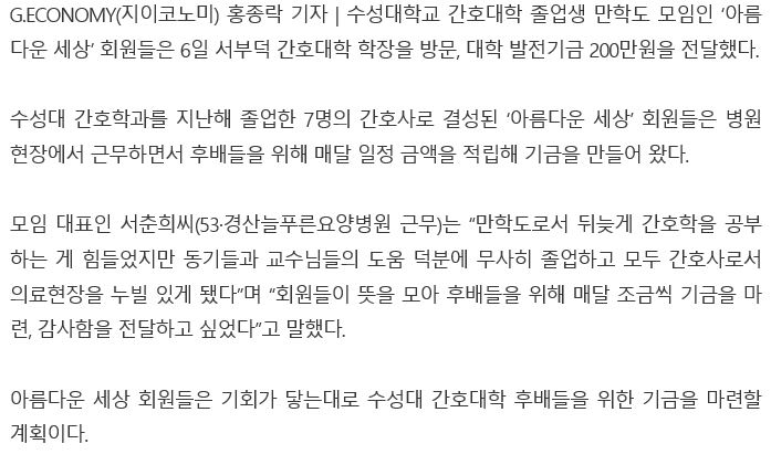 간호대학 만학도 모임 아름다운 세상 발전기금 전달 페이지 정보 작성자 간호학과 댓글 0건 조회 1,625회 작성일 22-07-08 10:05 목록 본문 간호대학 만학도 모임 아름다운 세상 발전기금 전달 이전글2022학년도 간호대학 신입생 학과적응 프로그램 22.09.07 다음글2022학년도 The Learning Club 경진대회 22.06.20