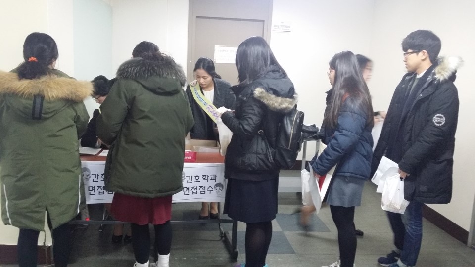 정시 면접 온 학생들이 면접 접수대기표를 받고 있는 모습!
