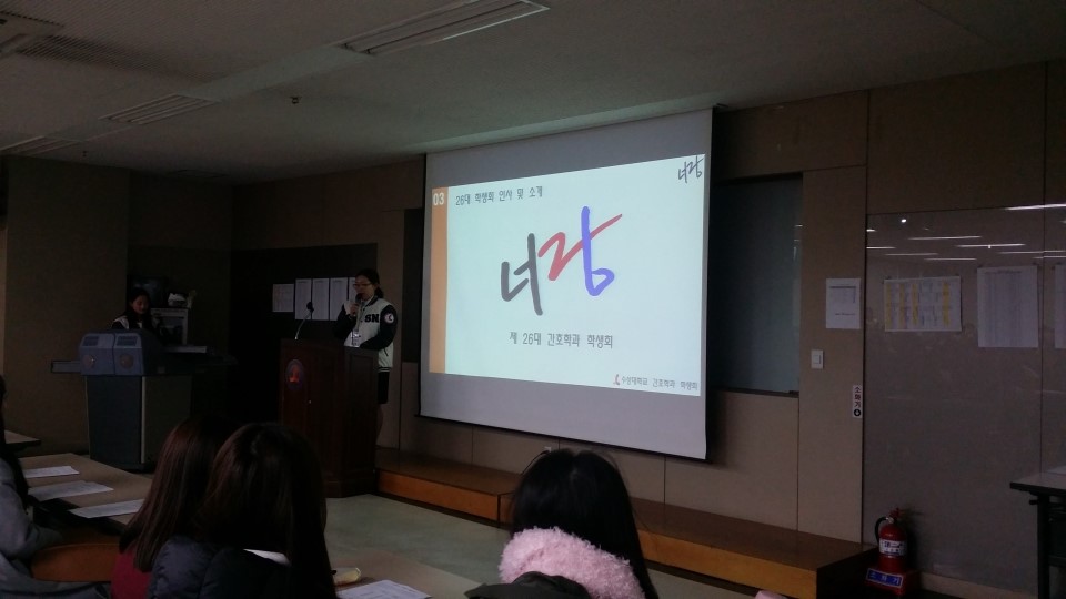 신입생들에게 26대 학생회를 소개하고있습니다~
