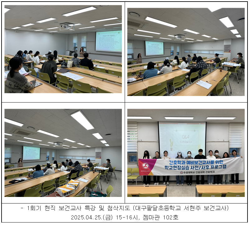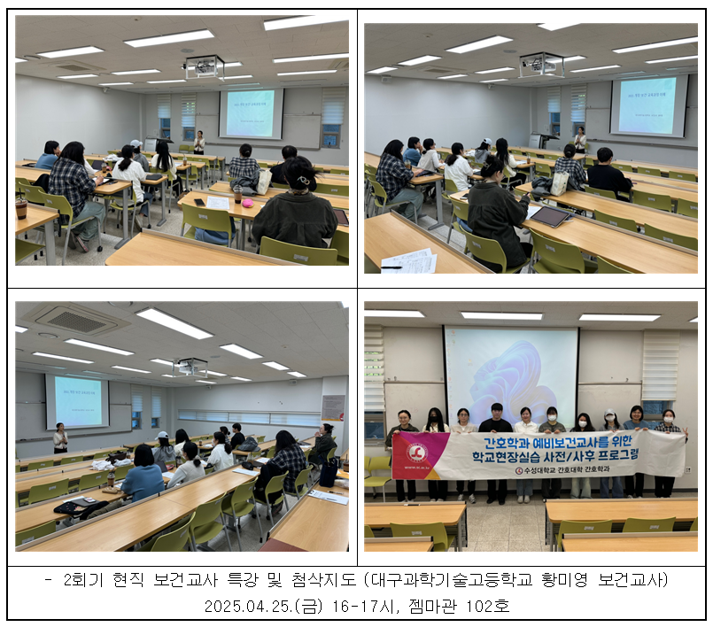 2025 학교현장실습 사전프로그램(교직) 페이지 정보 작성자 간호학과 댓글 0건 조회 136회 작성일 25-11-13 17:22 목록 본문 1. 행사명: 2025 학교현장실습 사전프로그램(교직)2. 일 시: 2025년 04월 25일(금) 16~17시3. 장 소: 젬마관 102호 이전글2025 황금효잔치 봉사활동 25.11.13 다음글2025핵심술기특강(전공실무집중교육) 25.11.12