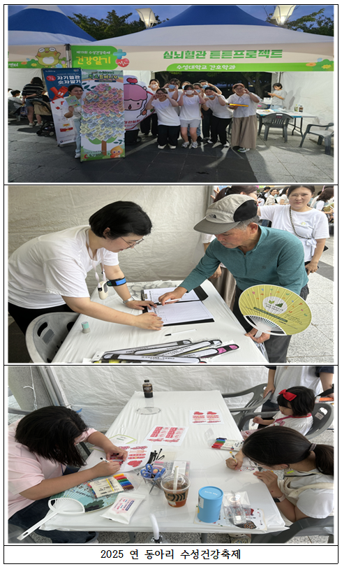 2025 연 동아리 수성건강축제 페이지 정보 작성자 간호학과 댓글 0건 조회 141회 작성일 25-11-14 11:16 목록 본문 1. 행사명: 2025 연 동아리 수성건강축제2. 일 시: 2025.09. 13.(토) 16:00~21:003. 장 소: 대구 스타디움 서편 광장 일대 이전글2025 학교현장실습 사후프로그램(겨직) 25.11.14 다음글2025 간호학과 학생회 교내행사 25.11.14