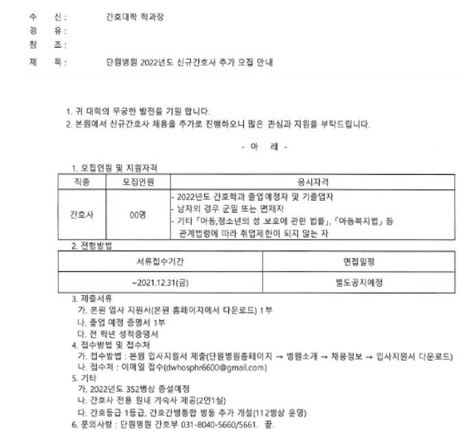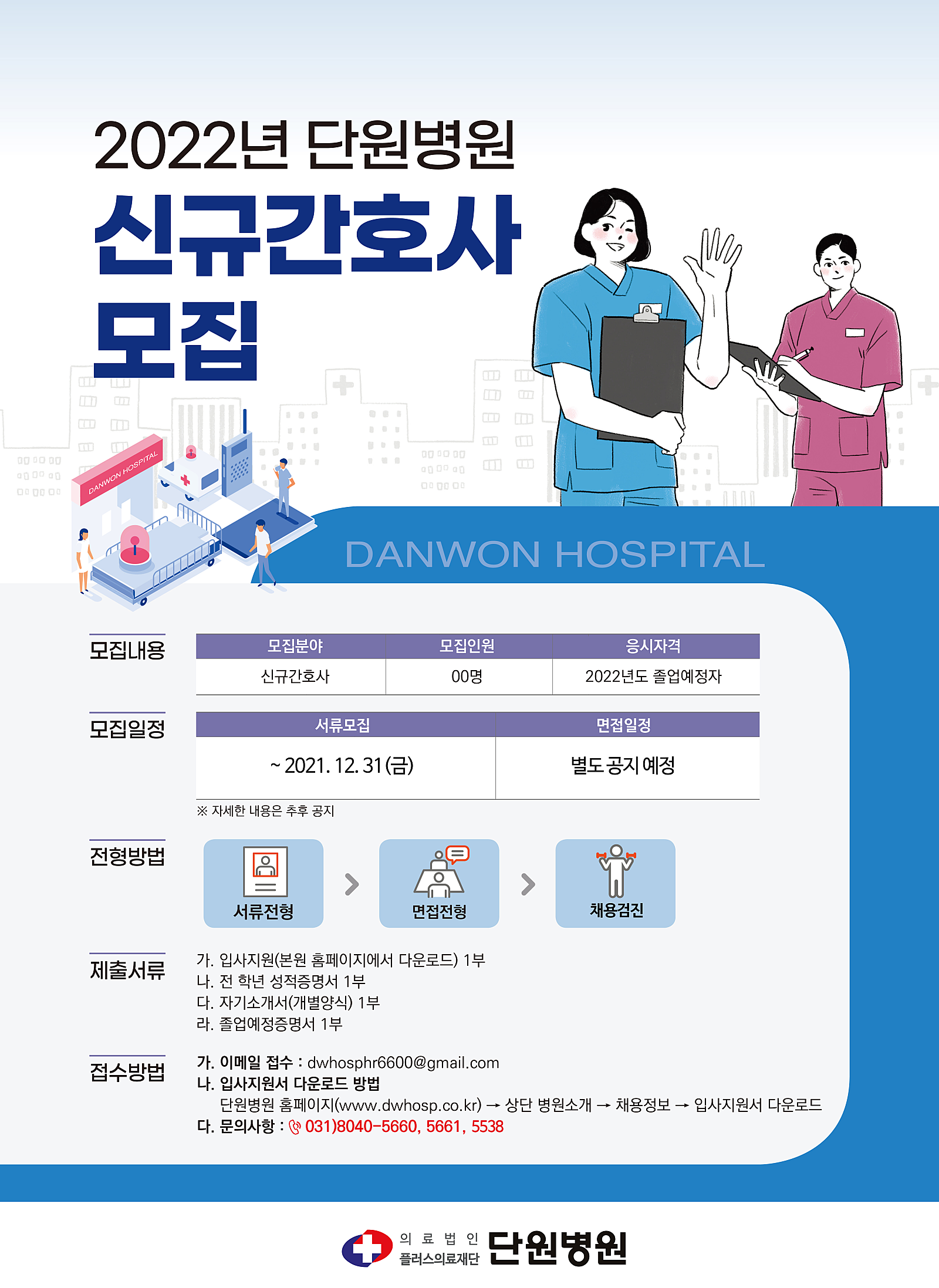 2022 단원병원 신규간호사 채용 안내 페이지 정보 작성자 간호학과 댓글 0건 조회 1,266회 작성일 21-12-06 13:12 목록 본문 이전글2022 남산병원 신규간호사 채용 공고 21.12.14 다음글2022 부천세종병원 신규간호사 채용 안내 21.12.01