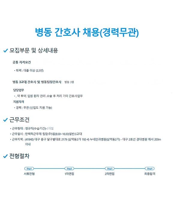 2022 누네안과병원 간호사 채용 안내 페이지 정보 작성자 간호학과 댓글 0건 조회 1,425회 작성일 22-01-18 10:04 목록 본문 이전글2022 보훈심사 대체인력(기간제근로자) 채용 관련 안내 22.01.18 다음글2022 울산병원 신규간호사 채용 안내 21.12.17