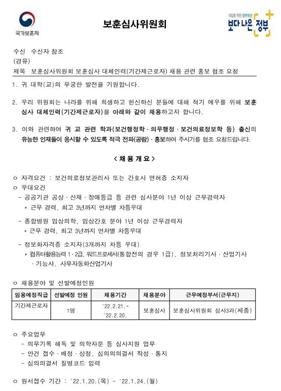 2022 보훈심사 대체인력(기간제근로자) 채용 관련 안내 페이지 정보 작성자 간호학과 댓글 0건 조회 1,230회 작성일 22-01-18 10:21 목록 본문 이전글2022 한마음재단 하나병원 신규간호사 채용 안내 22.01.19 다음글2022 누네안과병원 간호사 채용 안내 22.01.18