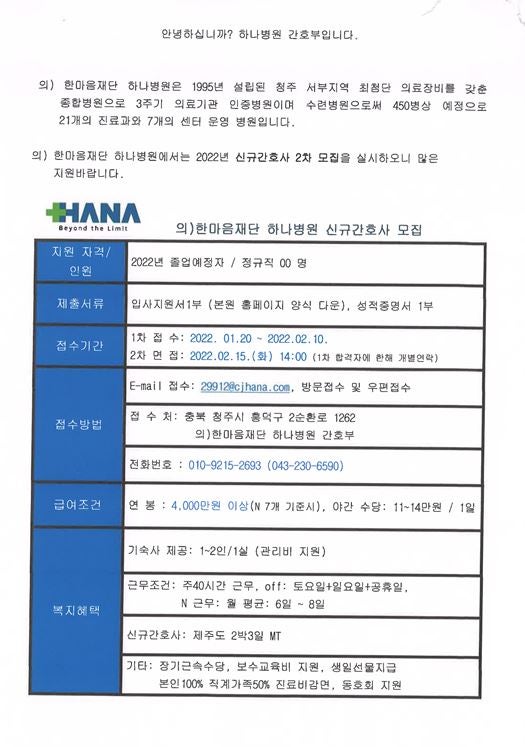 2022 한마음재단 하나병원 신규간호사 채용 안내 페이지 정보 작성자 간호학과 댓글 0건 조회 1,209회 작성일 22-01-19 14:45 목록 본문 이전글2022 첨단요양병원 간호사 채용 안내 22.01.19 다음글2022 보훈심사 대체인력(기간제근로자) 채용 관련 안내 22.01.18