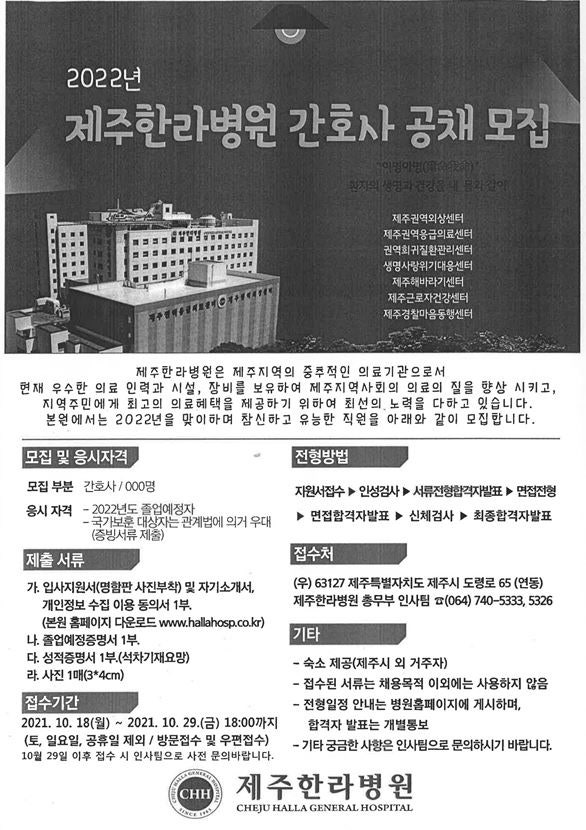 2022 제주한라병원 신규간호사 채용 안내 페이지 정보 작성자 간호학과 댓글 0건 조회 1,338회 작성일 21-10-29 09:08 목록 본문 이전글2022 보바스기념병원 신규간호사 채용 안내 21.10.29 다음글2022 대동병원 신규간호사 채용 안내 21.10.20