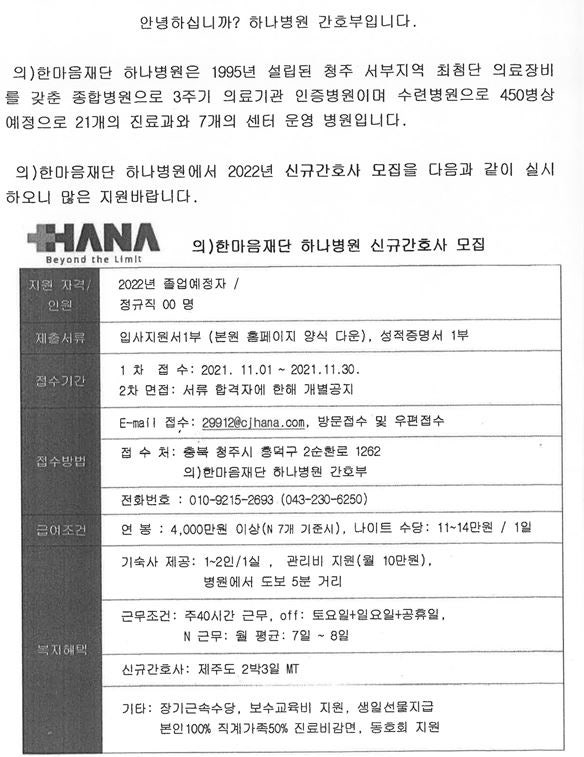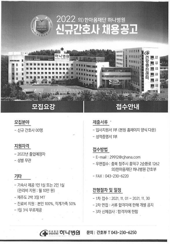 2022 하나병원 신규간호사 모집 안내 페이지 정보 작성자 간호학과 댓글 0건 조회 1,329회 작성일 21-11-01 11:27 목록 본문 이전글2022 김천의료원 신규간호사 채용 안내 21.11.01 다음글2022 푸른병원 신규간호사 채용 안내 21.10.29