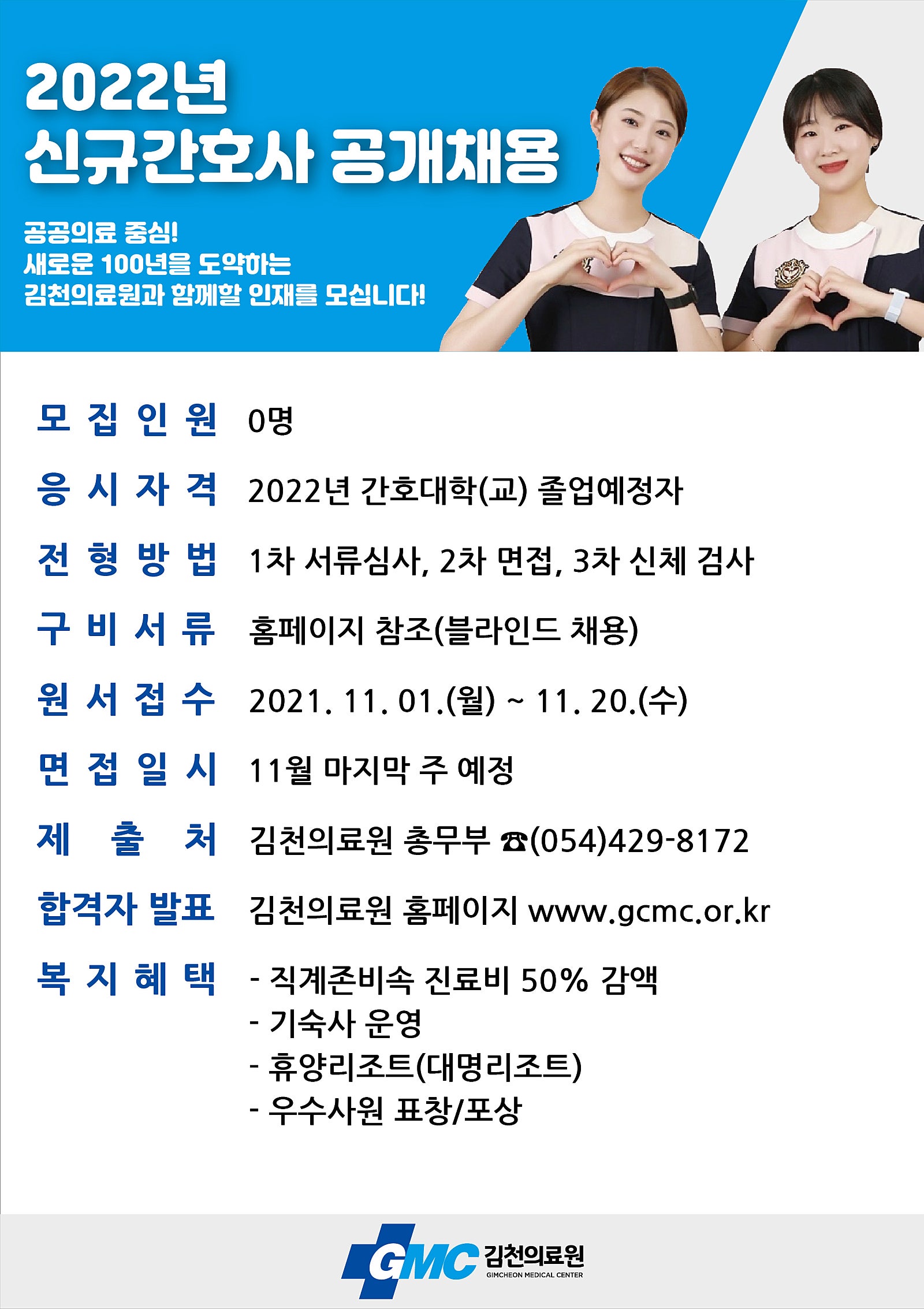 2022 김천의료원 신규간호사 채용 안내 페이지 정보 작성자 간호학과 댓글 0건 조회 1,344회 작성일 21-11-01 15:34 목록 본문 이전글2022 삼일병원 신규간호사 채용 안내 21.11.03 다음글2022 하나병원 신규간호사 모집 안내 21.11.01