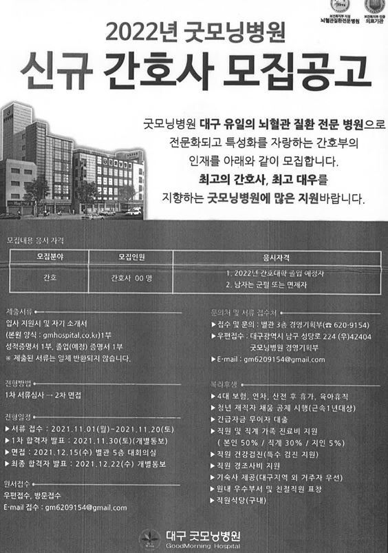 2022 굿모닝병원 신규간호사 채용 안내 페이지 정보 작성자 간호학과 댓글 0건 조회 1,297회 작성일 21-11-05 11:22 목록 본문 이전글2022 보광병원 신규간호사 채용 안내 21.11.08 다음글2022 삼일병원 신규간호사 채용 안내 21.11.03