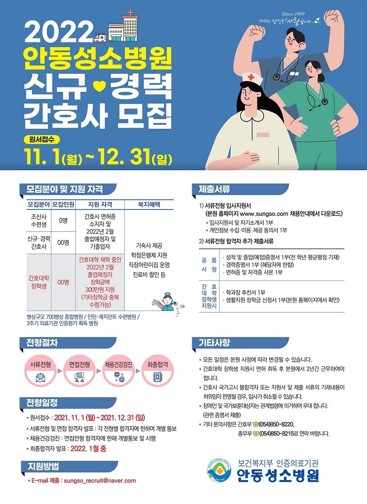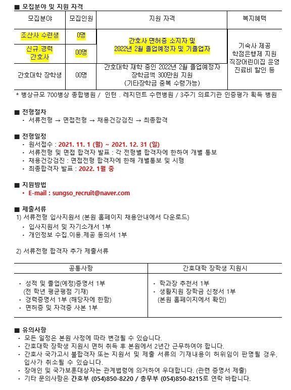 2022 안동성소병원 신규간호사 모집 안내 페이지 정보 작성자 간호학과 댓글 0건 조회 1,326회 작성일 21-11-09 11:52 목록 본문 이전글2022 대구의료원 신규간호사 채용 안내 21.11.12 다음글2022 보광병원 신규간호사 채용 안내 21.11.08