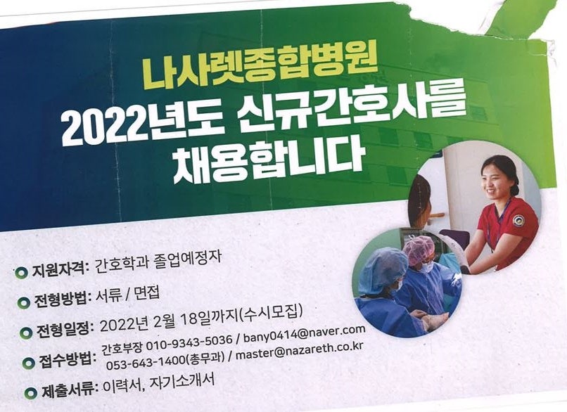 2022 나사렛종합병원 신규간호사 채용 페이지 정보 작성자 간호학과 댓글 0건 조회 1,288회 작성일 21-11-24 17:44 목록 본문 이전글2022 신세계여성병원 신규간호사 채용 안내 21.11.24 다음글2021 대구가톨릭대학교병원 정규직 간호사 채용 안내 21.11.24