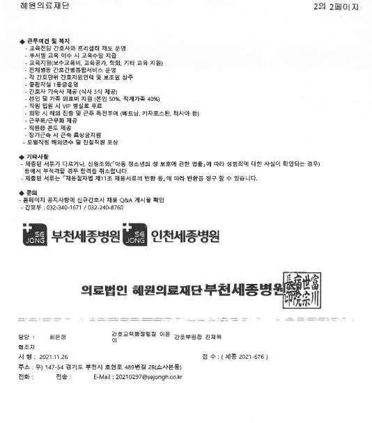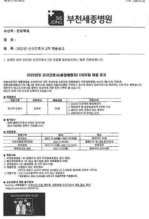 2022 부천세종병원 신규간호사 채용 안내 페이지 정보 작성자 간호학과 댓글 0건 조회 1,241회 작성일 21-12-01 09:55 목록 본문 이전글2022 단원병원 신규간호사 채용 안내 21.12.06 다음글2022 로즈마리병원 신규간호사 채용 안내 21.11.27