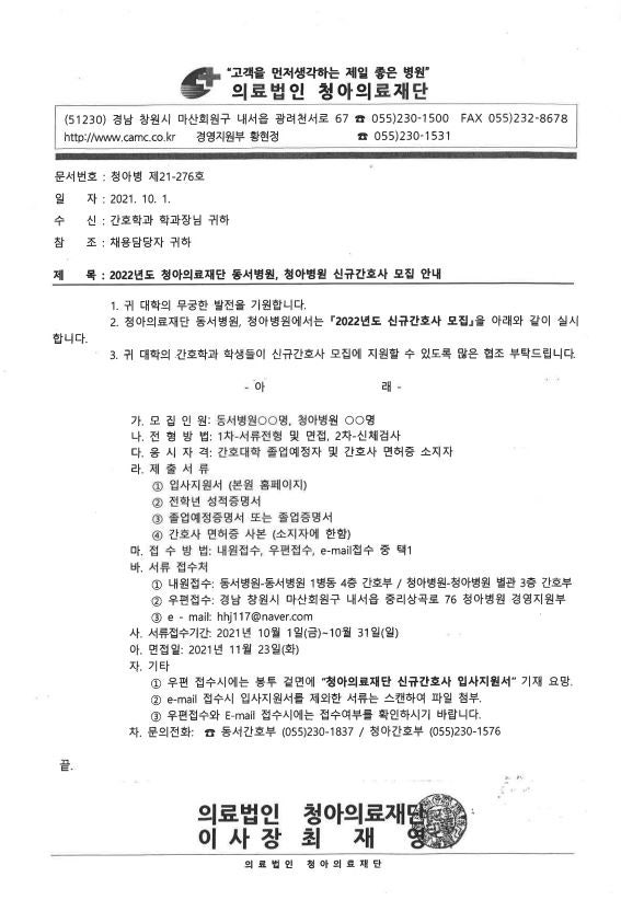 2022 청아의료재단 신규간호사 모집 안내 페이지 정보 작성자 간호학과 댓글 0건 조회 1,321회 작성일 21-10-12 17:32 목록 본문 이전글2022 당진종합병원 신규간호사 모집공고 21.10.12 다음글2022 효성병원 간호사 채용공고 21.10.12