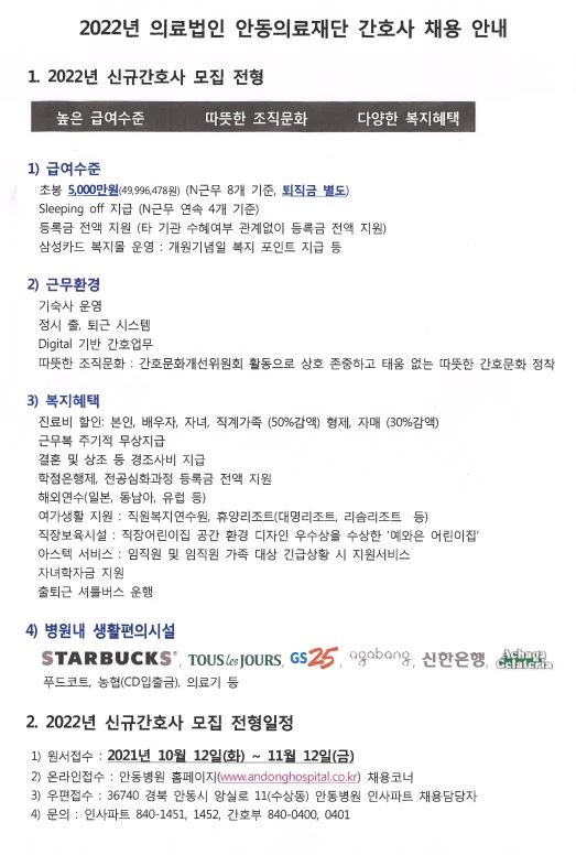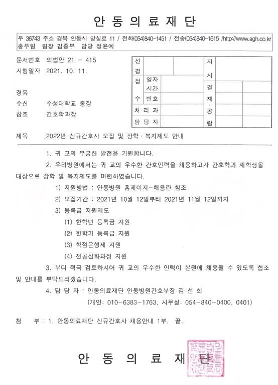 2022 안동의료재단 신규간호사 모집 안내 페이지 정보 작성자 간호학과 댓글 0건 조회 1,343회 작성일 21-10-13 16:17 목록 본문 이전글2022 안성성모병원 신입간호사 채용 안내 21.10.18 다음글2022 진천성모병원 신규간호사 채용 안내 21.10.13