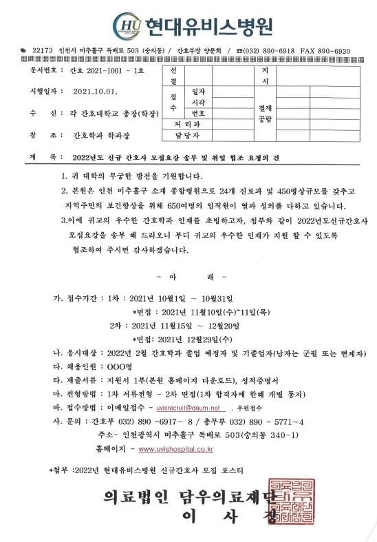 2022 현대유비스병원 신규간호사 채용 안내 페이지 정보 작성자 간호학과 댓글 0건 조회 1,287회 작성일 21-10-18 15:53 목록 본문 이전글2022 갑을장유병원 신규간호사 채용 안내 21.10.18 다음글2022 안성성모병원 신입간호사 채용 안내 21.10.18