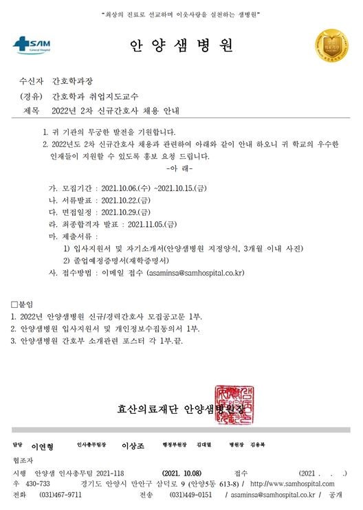 0. 공 문:[안양샘병원]2022년신규간호사모집채용안내