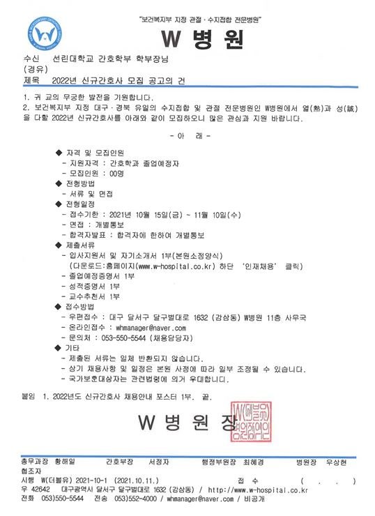 2022 W병원 신규간호사 모집 공고 페이지 정보 작성자 간호학과 댓글 0건 조회 1,545회 작성일 21-10-19 13:08 목록 본문 이전글2022 MS재건병원 신규간호사 채용 안내 21.10.19 다음글2022 안양샘병원 신규간호사 채용 안내 21.10.18