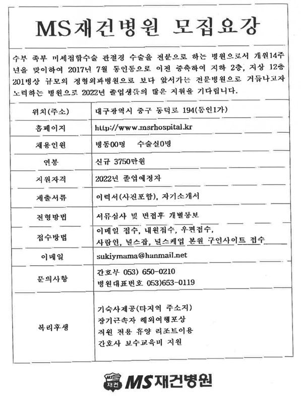 2022 MS재건병원 신규간호사 채용 안내 페이지 정보 작성자 간호학과 댓글 0건 조회 1,470회 작성일 21-10-19 16:09 목록 본문 이전글2022 성수의료재단(인천백병원. 비에스종합병원) 신규간호사 채용 안내 21.10.20 다음글2022 W병원 신규간호사 모집 공고 21.10.19