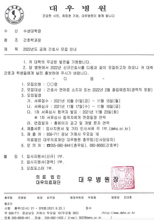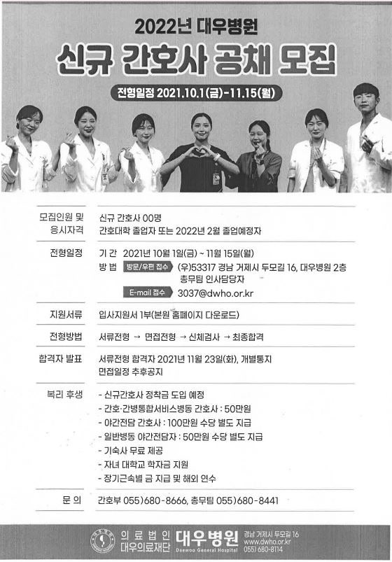 2022 대우병원 신규간호사 채용 공고 페이지 정보 작성자 간호학과 댓글 0건 조회 1,420회 작성일 21-09-27 18:15 목록 본문 이전글2022 검단탑종합병원 신규간호사 채용 안내 21.09.29 다음글2022 충주의료원 신규간호사 채용 안내 21.09.15