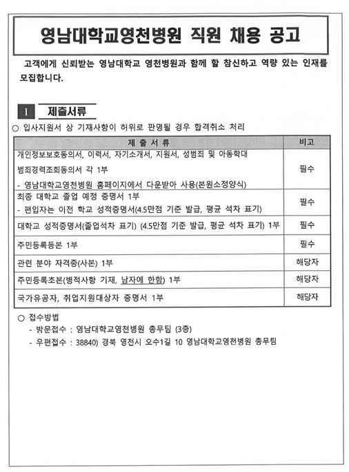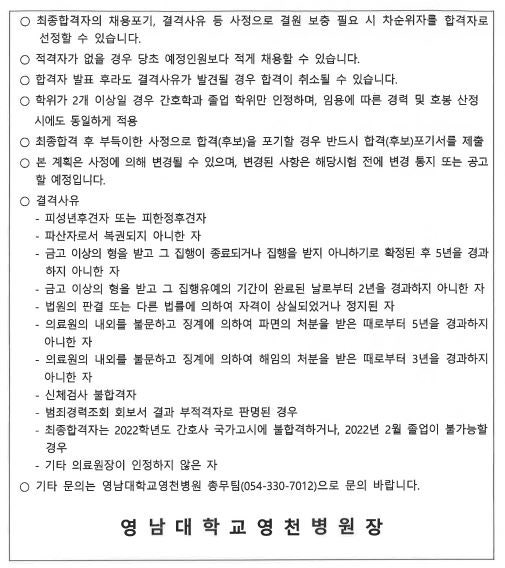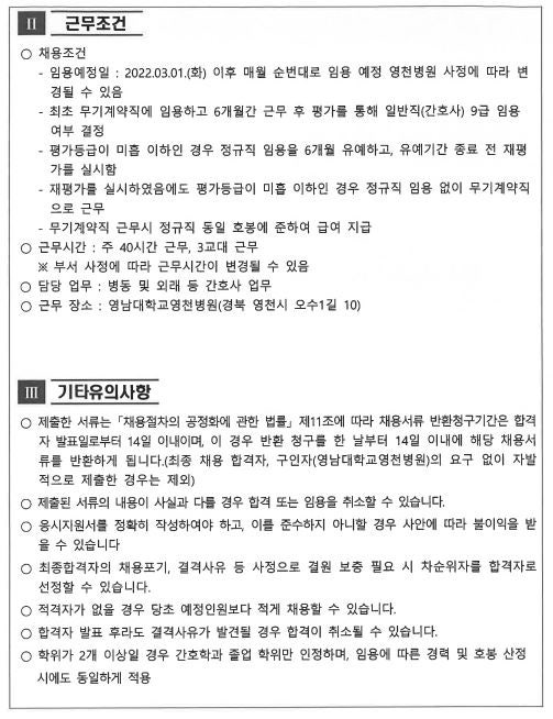 2022 영남대학교영천병원 직원 채용 안내 페이지 정보 작성자 간호학과 댓글 0건 조회 1,360회 작성일 21-10-01 14:28 목록 본문 이전글2022 문경제일병원 간호사 채용 안내 21.10.05 다음글2022 검단탑종합병원 신규간호사 채용 안내 21.09.29