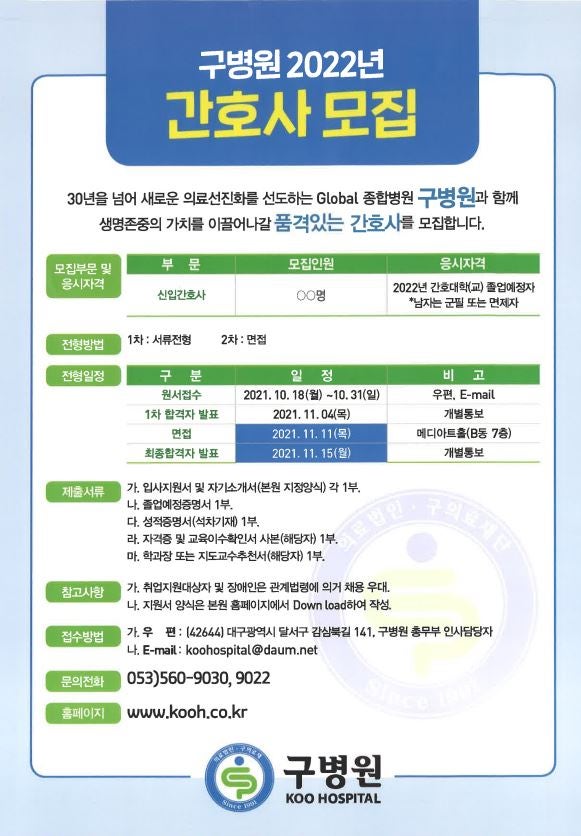 2022 구병원 간호사 채용 안내 페이지 정보 작성자 간호학과 댓글 0건 조회 1,287회 작성일 21-10-12 17:30 목록 본문 이전글2022 효성병원 간호사 채용공고 21.10.12 다음글2022 인천힘찬종합병원 신규간호사 채용 안내 21.10.12