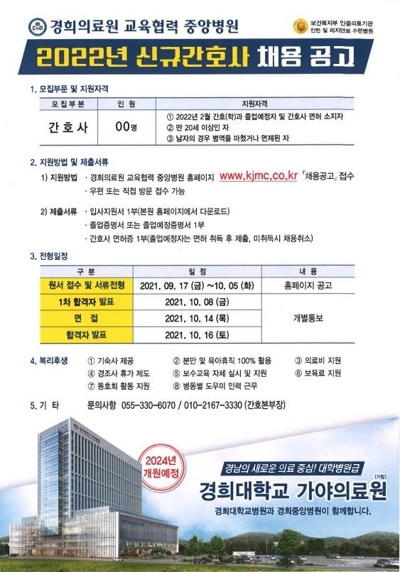 2022 경희의료원 교육협력 중앙병원 신규간호사 채용 공고 페이지 정보 작성자 간호학과 댓글 0건 조회 1,481회 작성일 21-09-06 13:58 목록 본문 이전글2022 차의과학대학교 부속 구미차병원 신규 및 경력 간호사 채용 안내 21.09.06 다음글2022 해운대부민병원 신규간호사 채용 안내 21.09.03