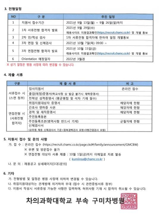 2022 차의과학대학교 부속 구미차병원 신규 및 경력 간호사 채용 안내 페이지 정보 작성자 간호학과 댓글 0건 조회 1,487회 작성일 21-09-06 13:59 목록 본문 이전글2022 대자인병원 신규간호사 채용 안내 21.09.06 다음글2022 경희의료원 교육협력 중앙병원 신규간호사 채용 공고 21.09.06