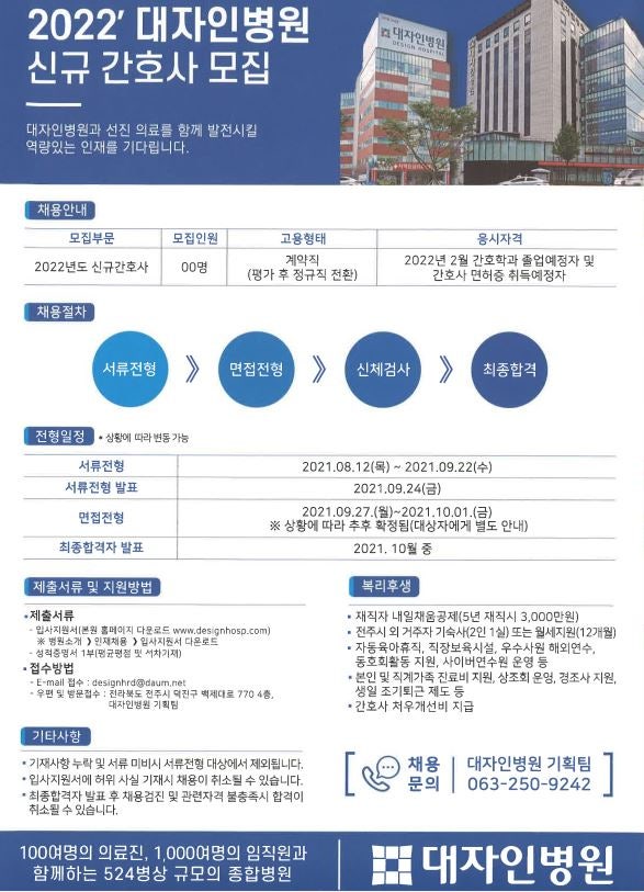 2022 대자인병원 신규간호사 채용 안내 페이지 정보 작성자 간호학과 댓글 0건 조회 1,392회 작성일 21-09-06 14:00 목록 본문 이전글2022 아산충무병원 신규 간호사 채용 안내 21.09.06 다음글2022 차의과학대학교 부속 구미차병원 신규 및 경력 간호사 채용 안내 21.09.06