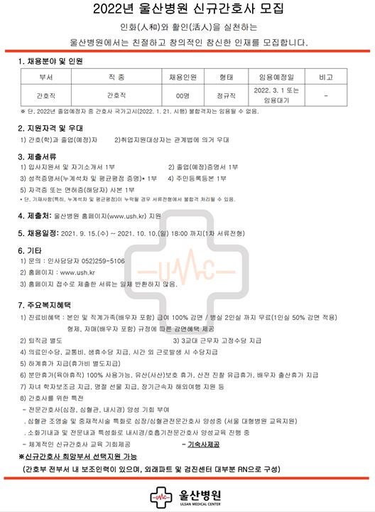 2022 울산병원 신규간호사 모집 안내 페이지 정보 작성자 간호학과 댓글 0건 조회 1,412회 작성일 21-09-09 16:17 목록 본문 이전글2022 대전한국병원 신규간호사 채용 안내 21.09.10 다음글2022 좋은문화병원 신규간호사 모집 안내 21.09.07