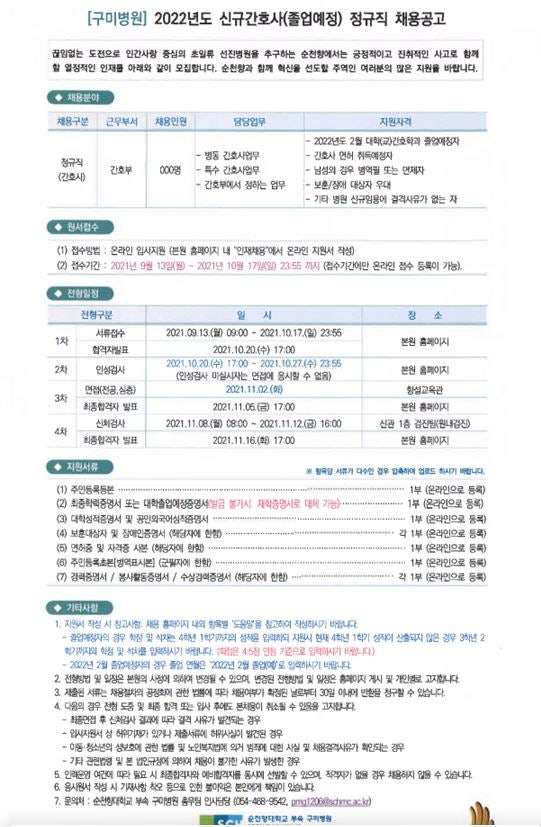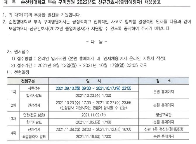 2022 순천향대학교 부속 구미병원 신규간호사 채용 안내 페이지 정보 작성자 간호학과 댓글 0건 조회 1,320회 작성일 21-09-10 16:27 목록 본문 이전글2022 명지성모병원 신입/경력 간호사 채용 안내 21.09.13 다음글2022 대전한국병원 신규간호사 채용 안내 21.09.10