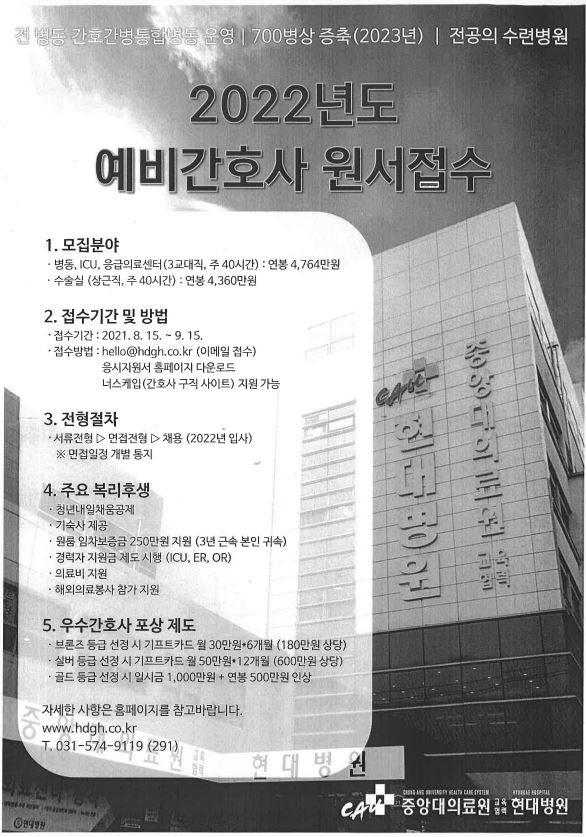 2022 중앙대의료원 교육협력 현대병원 신규간호사 채용 안내 페이지 정보 작성자 간호학과 댓글 0건 조회 1,607회 작성일 21-08-25 16:10 목록 본문 이전글2022 삼육서울병원 신규(경력) 간호사 채용 안내 21.08.25 다음글2022 세종병원 신규간호사 채용공고 21.08.19