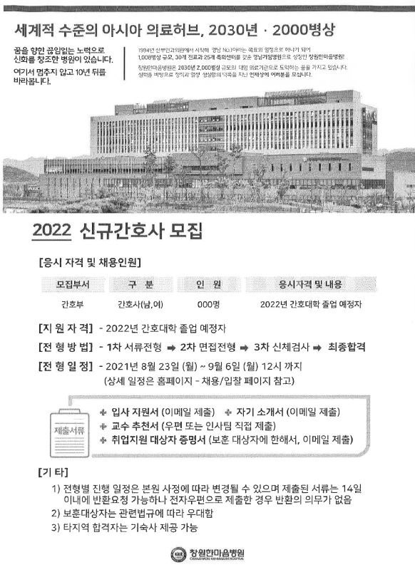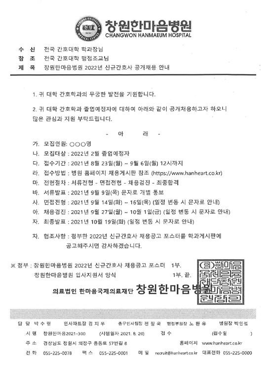 2022 한마음창원병원 신규간호사 채용 안내 페이지 정보 작성자 간호학과 댓글 0건 조회 1,516회 작성일 21-08-31 16:10 목록 본문 이전글2022 동국대학교 경주병원 신규 간호사 채용 안내 21.08.31 다음글2022 삼육서울병원 신규(경력) 간호사 채용 안내 21.08.25