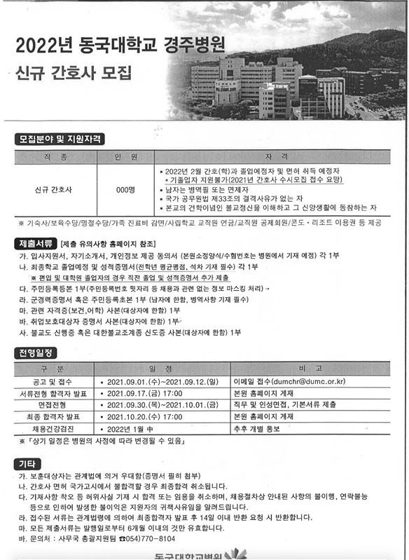 2022 동국대학교 경주병원 신규 간호사 채용 안내 페이지 정보 작성자 간호학과 댓글 0건 조회 1,515회 작성일 21-08-31 16:11 목록 본문 이전글2022 부산성모병원 신규간호사 채용 안내 21.08.31 다음글2022 한마음창원병원 신규간호사 채용 안내 21.08.31