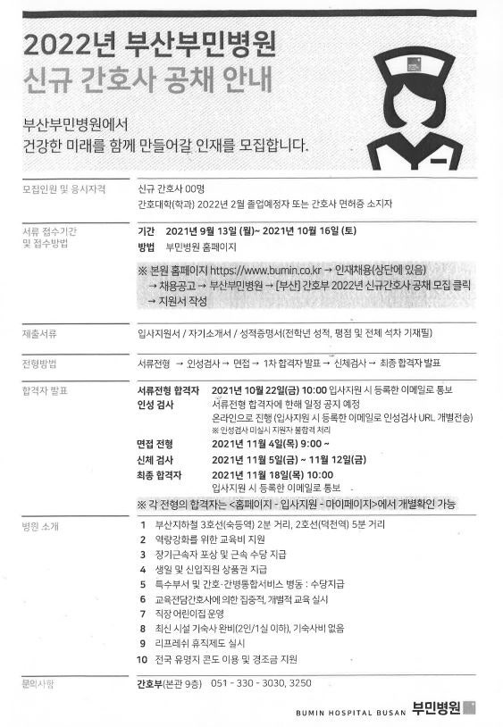 2022 부산부민병원 신규간호사 채용 안내 페이지 정보 작성자 간호학과 댓글 0건 조회 1,344회 작성일 21-09-02 16:31 목록 본문 이전글2022 해운대부민병원 신규간호사 채용 안내 21.09.03 다음글2022 뉴성민병원 신규간호사 채용 안내 21.09.02