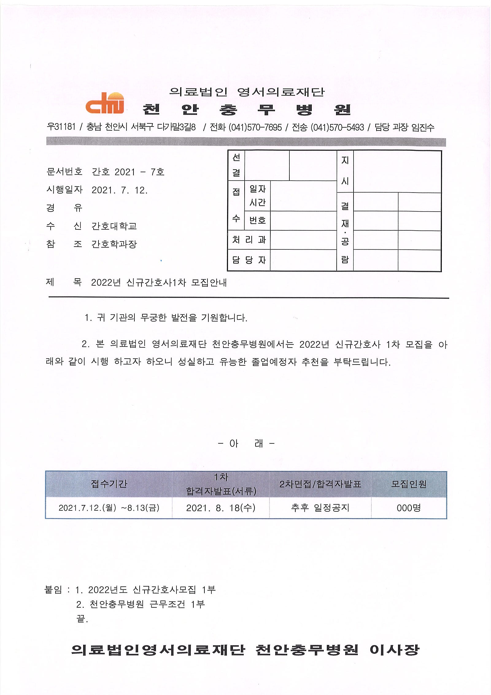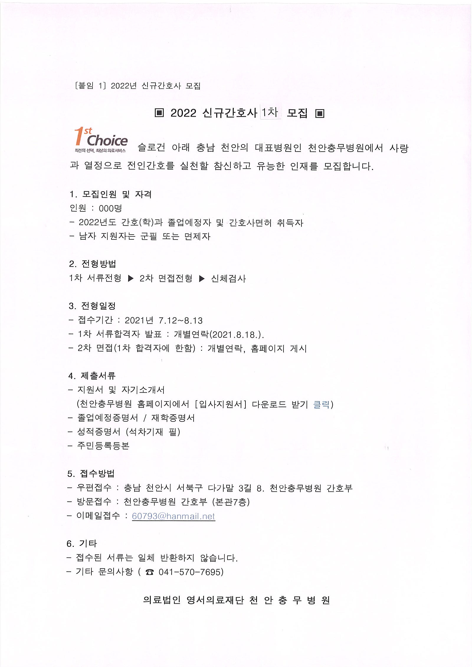 2022 천안충무병원 신규간호사 채용 안내 페이지 정보 작성자 간호학과 댓글 0건 조회 1,585회 작성일 21-07-13 11:07 목록 본문 이전글2022 센트럴병원 신규간호사 채용 안내 21.07.13 다음글2022 가톨릭대학교 의정부성모병원 신규간호사 채용 공고 21.07.13