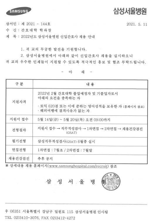 2022 삼성서울병원 신입간호사 채용 공고 페이지 정보 작성자 간호학과 댓글 0건 조회 1,868회 작성일 21-05-13 17:17 목록 본문 이전글2022 서울아산병원 신입간호사 온라인 채용 설명회 시행 안내 21.05.17 다음글2022 분당서울대학교병원 신입간호사 채용 안내 21.05.13