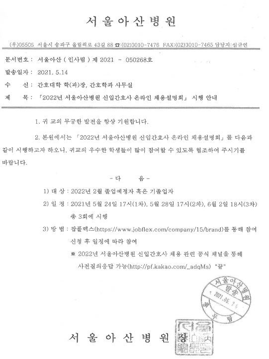 2022 서울아산병원 신입간호사 온라인 채용 설명회 시행 안내 페이지 정보 작성자 간호학과 댓글 0건 조회 1,872회 작성일 21-05-17 12:11 목록 본문 이전글2022 당진종합병원 채용 안내 21.05.21 다음글2022 삼성서울병원 신입간호사 채용 공고 21.05.13