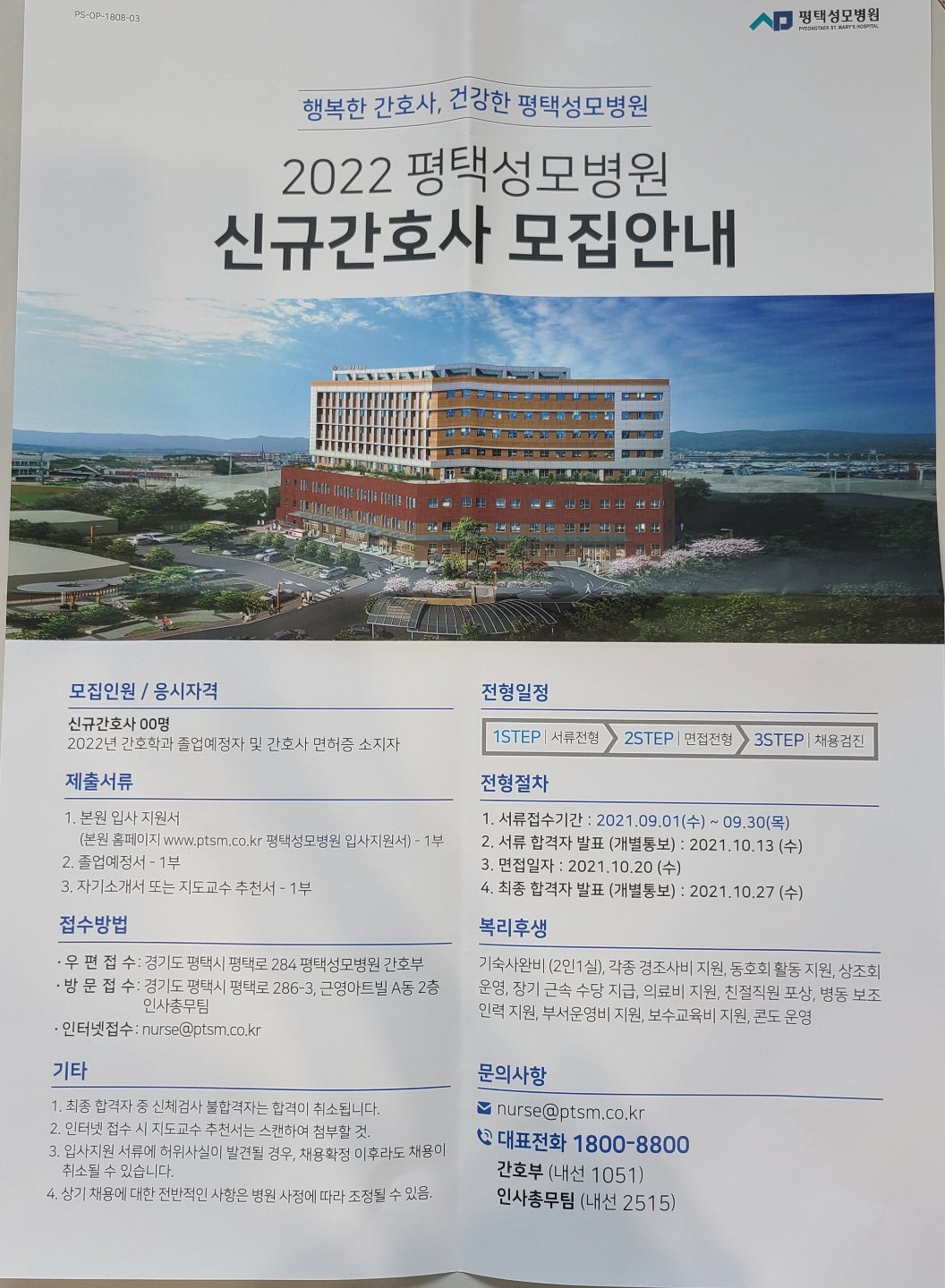 2022 평택성모병원 신규간호사 채용 안내 페이지 정보 작성자 간호학과 댓글 0건 조회 1,764회 작성일 21-06-30 11:18 목록 본문 이전글2021 대구가톨릭대학교병원 정규직 간호사 모집공고 21.07.02 다음글2022 안동의료재단 신규간호사 모집 안내 21.06.30