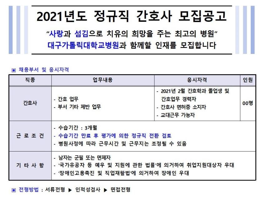 2021 대구가톨릭대학교병원 정규직 간호사 모집공고 페이지 정보 작성자 간호학과 댓글 0건 조회 1,921회 작성일 21-07-02 11:39 목록 본문 이전글2022 길의료재단 길병원 신규간호사 채용 공고 21.07.05 다음글2022 평택성모병원 신규간호사 채용 안내 21.06.30