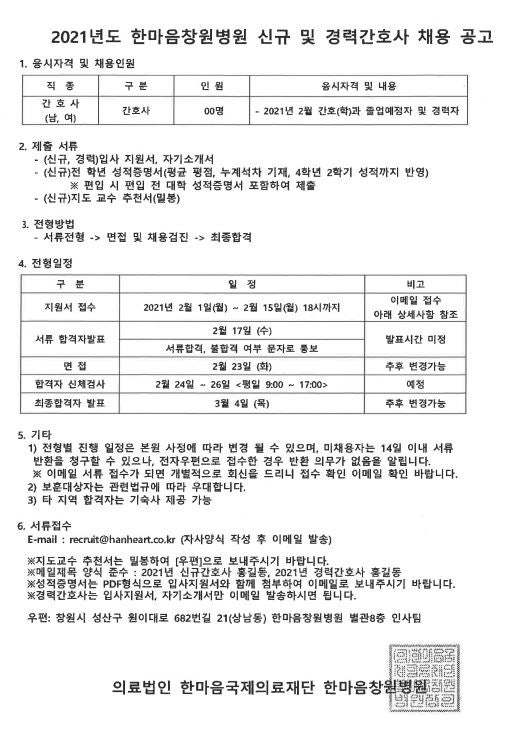 2021 한마음창원병원 신규 및 경력간호사 채용 공고 페이지 정보 작성자 간호학과 댓글 0건 조회 1,980회 작성일 21-01-26 09:25 목록 본문 이전글2021 세림병원 신규간호사 2차 채용 공고 21.01.28 다음글2021 울산 현대 계약직 간호사 21.01.20