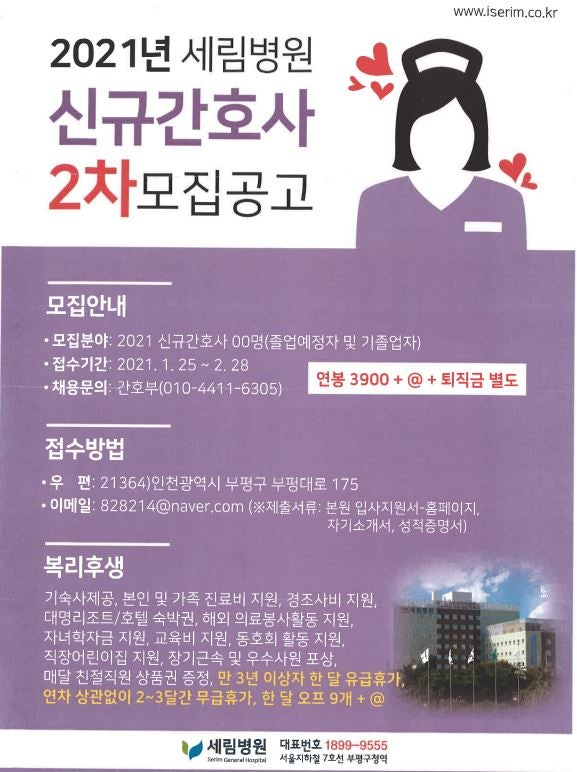 2021 세림병원 신규간호사 2차 채용 공고 페이지 정보 작성자 간호학과 댓글 0건 조회 2,008회 작성일 21-01-28 15:38 목록 본문 이전글2021 동남권원자력의학원 신규간호사 채용 공고 21.02.02 다음글2021 한마음창원병원 신규 및 경력간호사 채용 공고 21.01.26