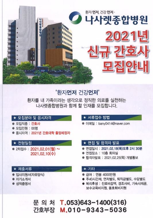 2021 나사렛종합병원 신규간호사 채용 공고 페이지 정보 작성자 간호학과 댓글 0건 조회 2,176회 작성일 21-02-05 09:52 목록 본문 이전글2021 미주병원(정신과) 간호사 모집 공고 21.02.18 다음글2021 동남권원자력의학원 신규간호사 채용 공고 21.02.02