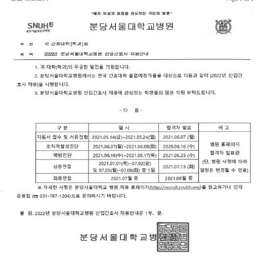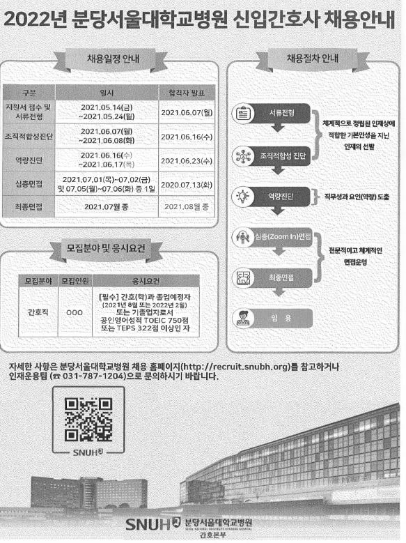2022 분당서울대학교병원 신입간호사 채용 안내 페이지 정보 작성자 간호학과 댓글 0건 조회 2,009회 작성일 21-05-13 16:07 목록 본문 이전글2022 삼성서울병원 신입간호사 채용 공고 21.05.13 다음글2021 누네안과병원 채용 공고 21.03.19