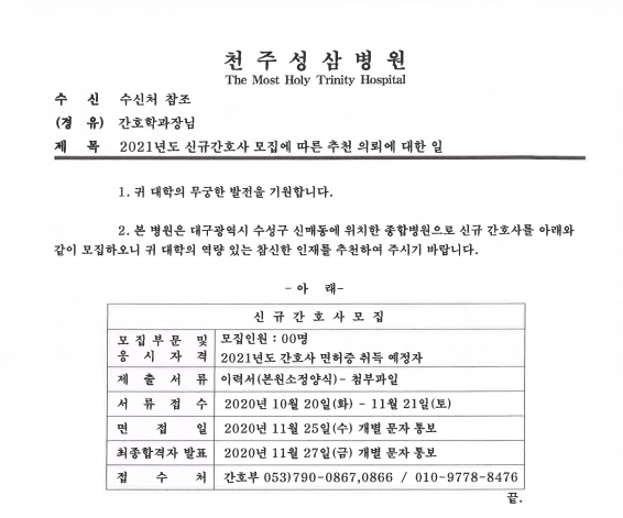 2021 천주성삼병원 신규간호사 채용 공고 페이지 정보 작성자 간호학과 댓글 0건 조회 1,988회 작성일 20-10-20 14:41 목록 본문 이전글2021 충청북도충주의료원 신규간호사 채용 공고 20.10.21 다음글2021 청천의료재단 안성성모병원 신규간호사 채용 공고 20.10.19