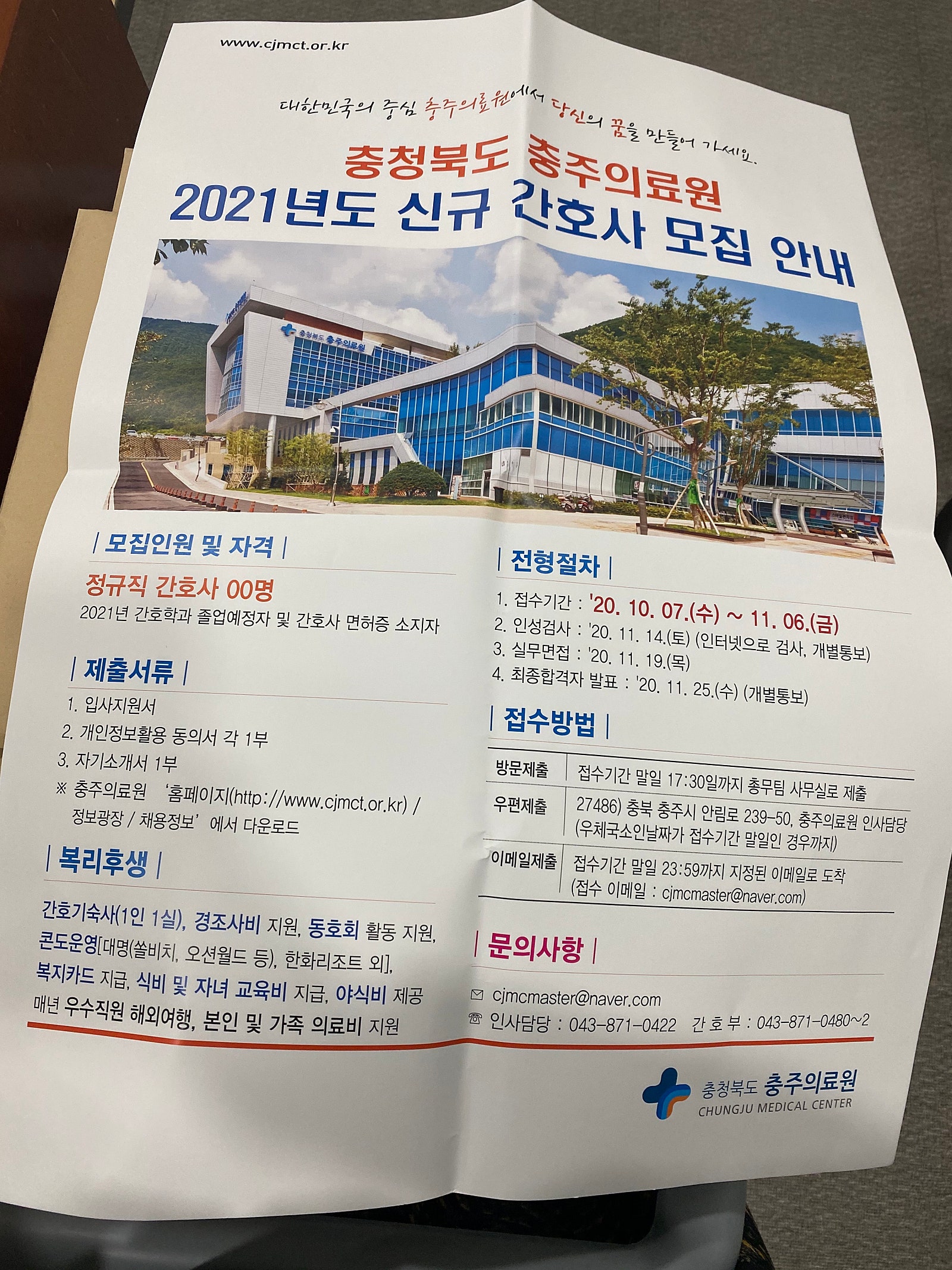 2021 충청북도충주의료원 신규간호사 채용 공고 페이지 정보 작성자 간호학과 댓글 0건 조회 1,947회 작성일 20-10-21 16:10 목록 본문 이전글2021 삼일병원 신규간호사 채용 공고 20.10.22 다음글2021 천주성삼병원 신규간호사 채용 공고 20.10.20