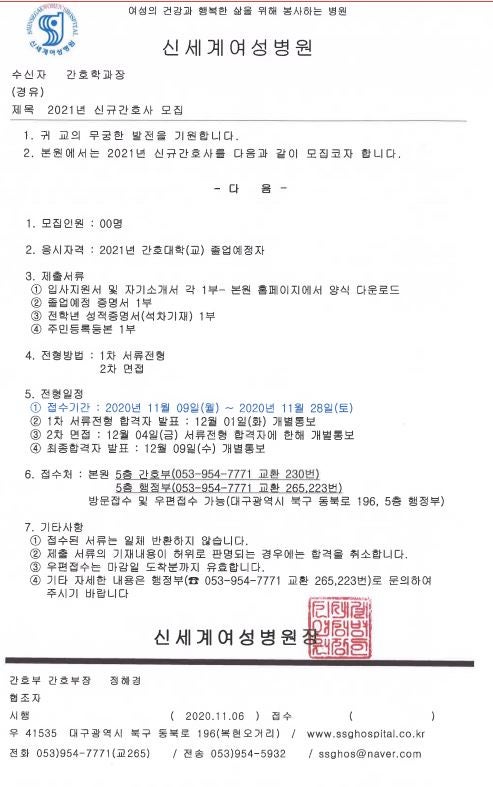 2021 신세계여성병원 신규간호사 채용 공고 페이지 정보 작성자 간호학과 댓글 0건 조회 2,133회 작성일 20-11-16 11:26 목록 본문 이전글2021 청아의료재단 동서병원, 청아병원 신규간호사 채용 공고 20.11.16 다음글경북대학교 간호대학 계약직원 채용공고 20.11.02