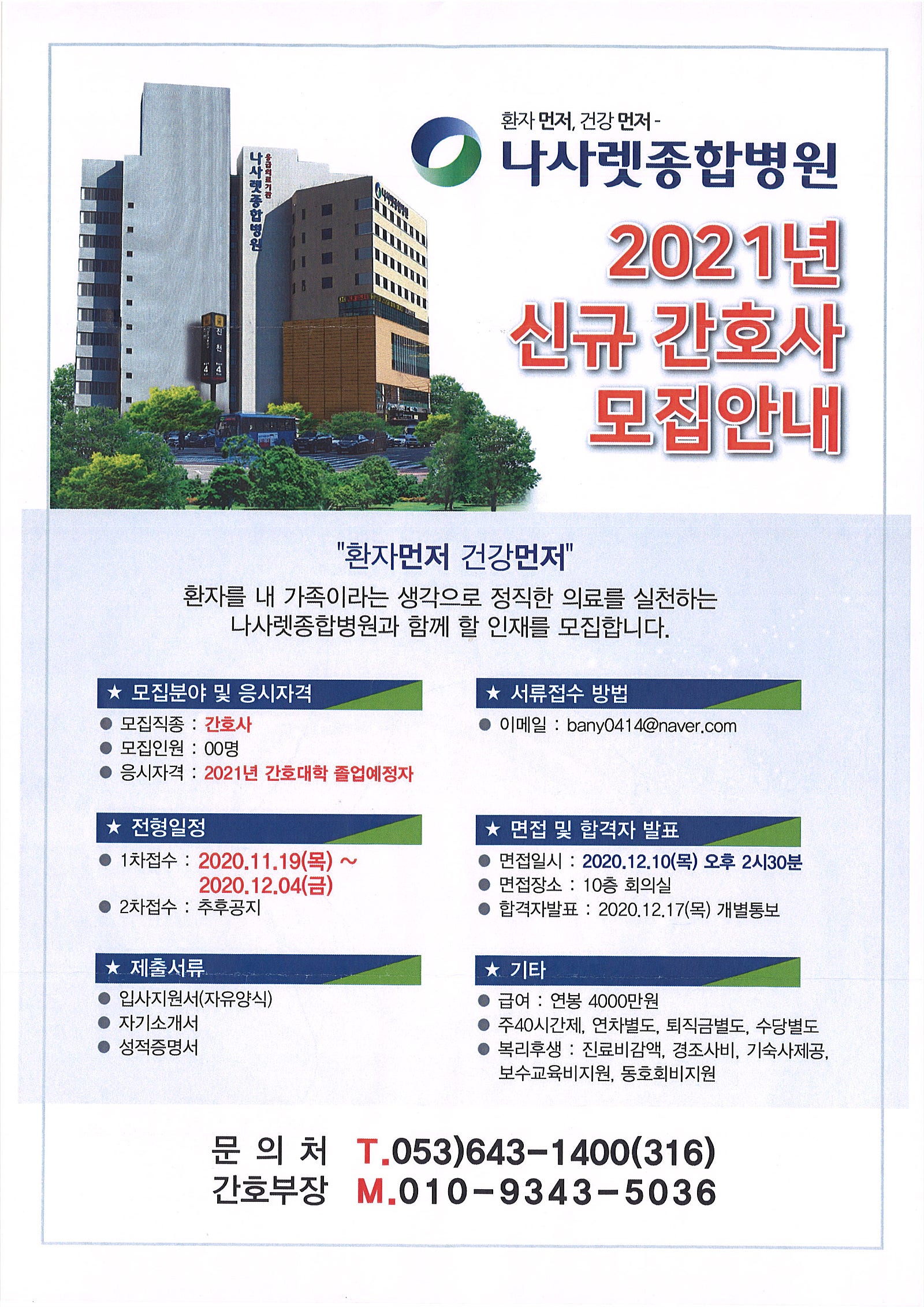 2021 나사렛종합병원 신규간호사 채용 공고 페이지 정보 작성자 간호학과 댓글 0건 조회 1,896회 작성일 20-11-19 17:40 목록 본문 이전글2021 메디플렉스 세종병원 신규간호사 2차 채용 공고 20.11.19 다음글2021 희명병원 신규간호사 채용 공고 20.11.16