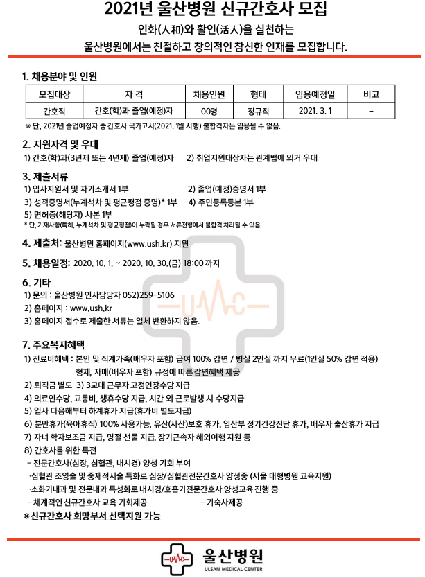 2021 울산병원 신규간호사 채용 공고 페이지 정보 작성자 간호학과 댓글 0건 조회 1,768회 작성일 20-09-22 18:51 목록 본문 이전글2021 세명병원 신규간호사 채용 공고 20.09.23 다음글2021 김천의료원 신규간호사 채용 공고 20.09.22