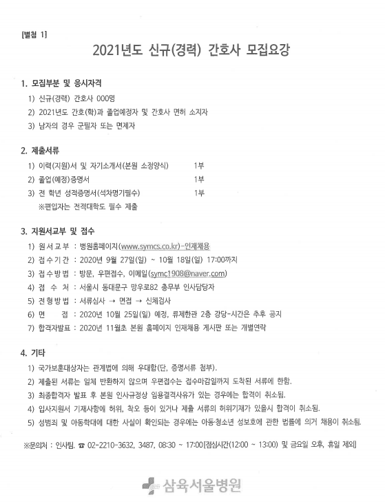 2021 삼육서울병원 신규(경력) 간호사 채용 공고 페이지 정보 작성자 간호학과 댓글 0건 조회 1,871회 작성일 20-09-25 13:10 목록 본문 이전글2021 구미강동병원 신규간호사 채용 공고 20.10.06 다음글2021 세명병원 신규간호사 채용 공고 20.09.23