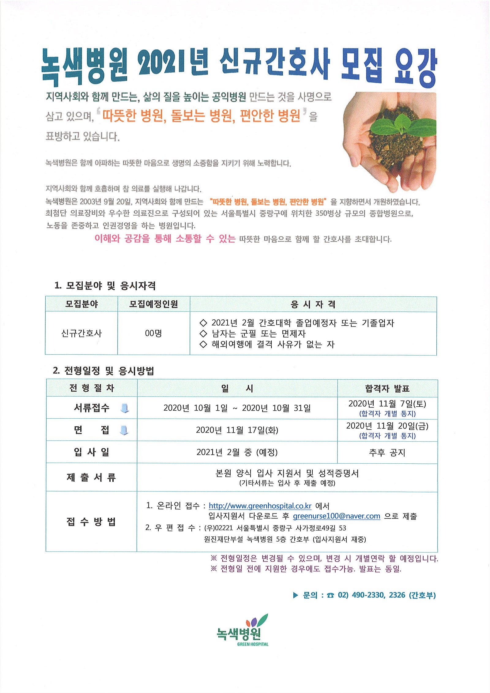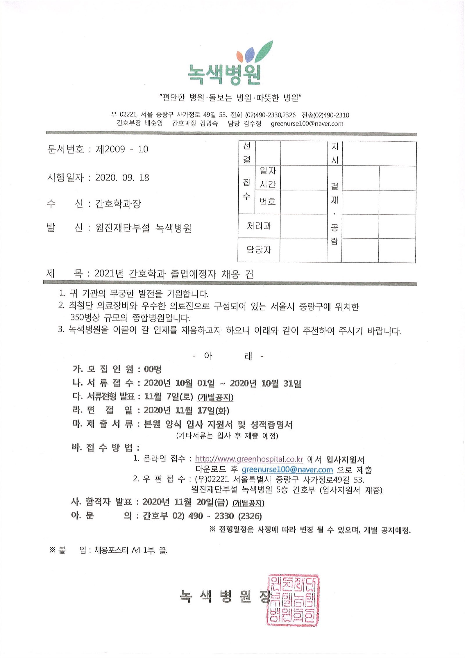 2021 녹색병원 신규간호사 채용 공고 페이지 정보 작성자 간호학과 댓글 0건 조회 1,868회 작성일 20-10-08 17:56 목록 본문 이전글2021 대구가톨릭대학교 칠곡가톨릭병원 신규 간호사 채용 공고 20.10.12 다음글2021 제주한라병원 간호사 채용 공고 20.10.08